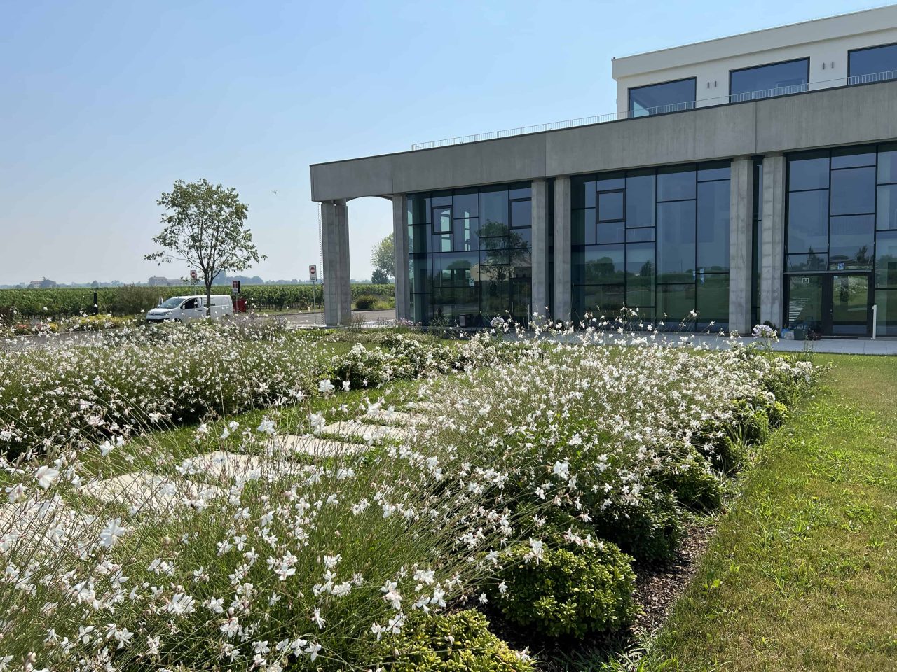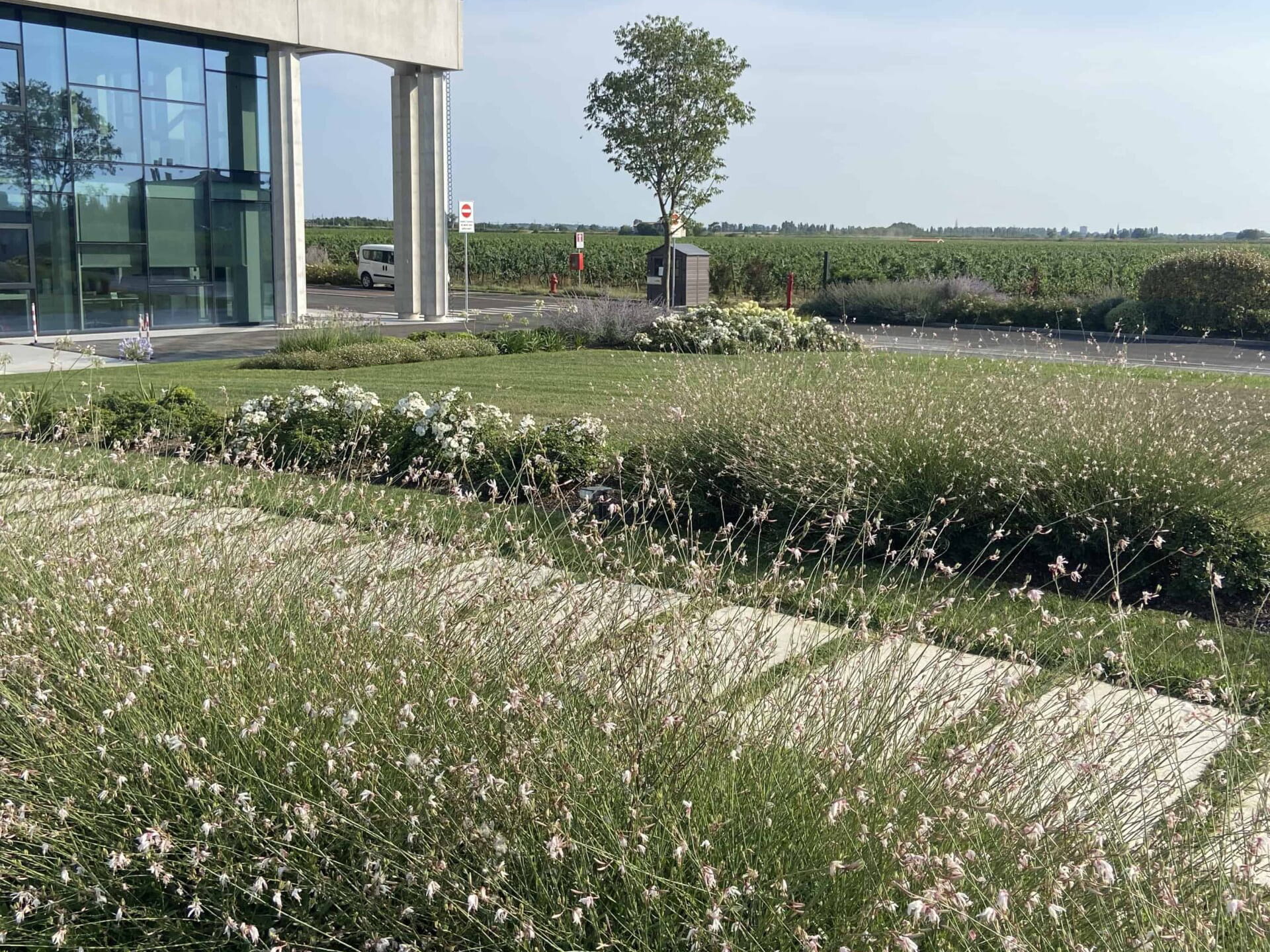 Scopri il connubio artistico e naturale in questo giardino d'arte, una cornice floreale che aggiunge fascino alle vigne di una cantina.