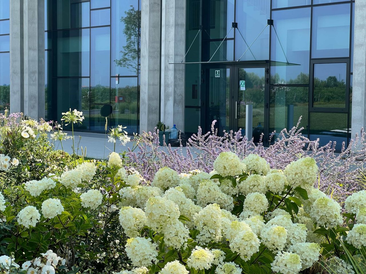 Il marciapiede in pietra divide con eleganza un manto erboso impeccabilmente curato, mentre ortensie, gaura e perovskia aggiungono un tocco floreale raffinato.