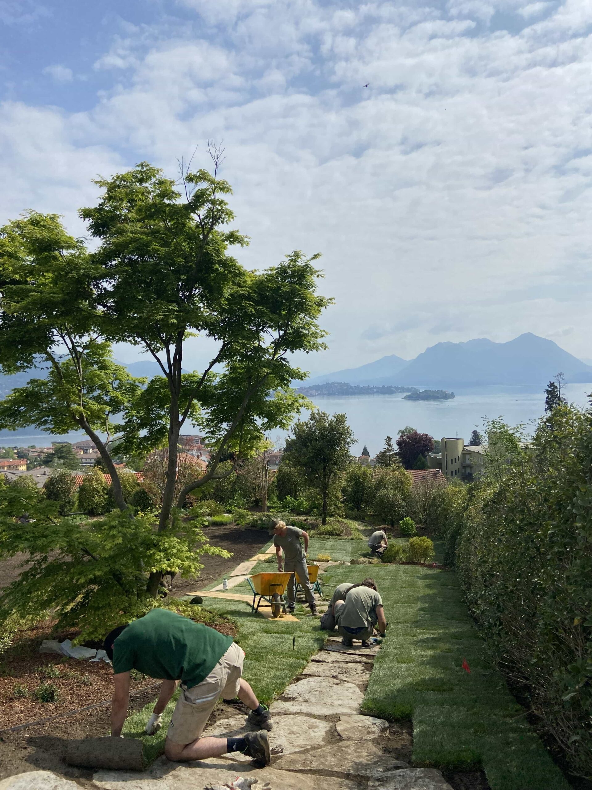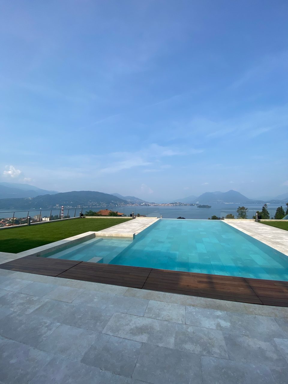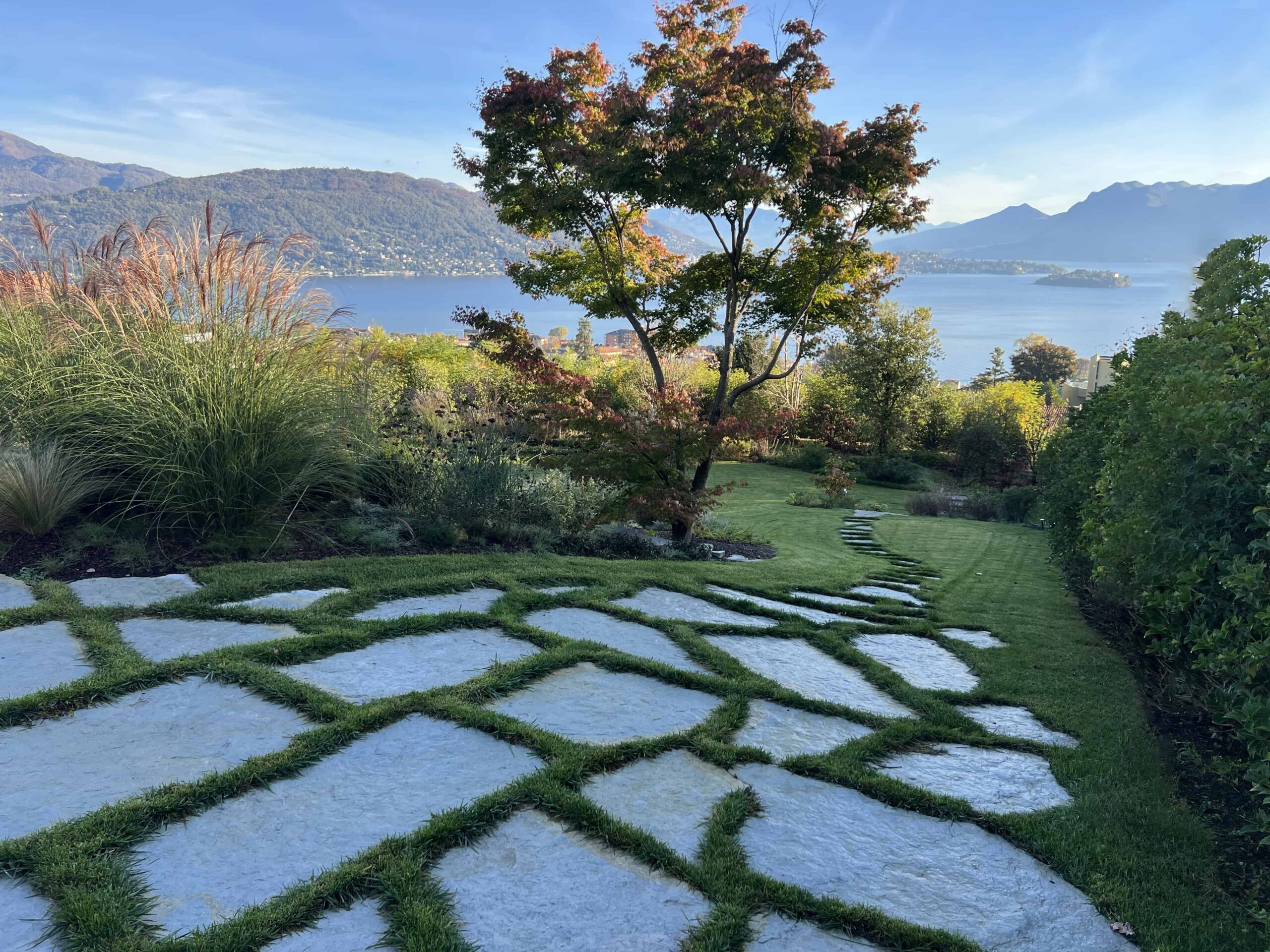 Il terreno in discesa si trasforma in un manto erboso impeccabilmente curato, attraversato con grazia da un marciapiede di pietra. Questo progetto celebra l’armonia tra la bellezza naturale e la tranquillità delle acque, offrendo una visione sublime di un giardino unico.