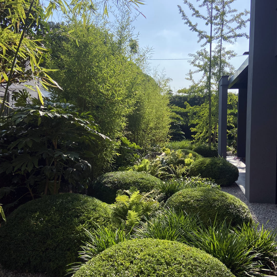 Verde moderno: taxus, ginkgo, buxus e liriope in armonia.