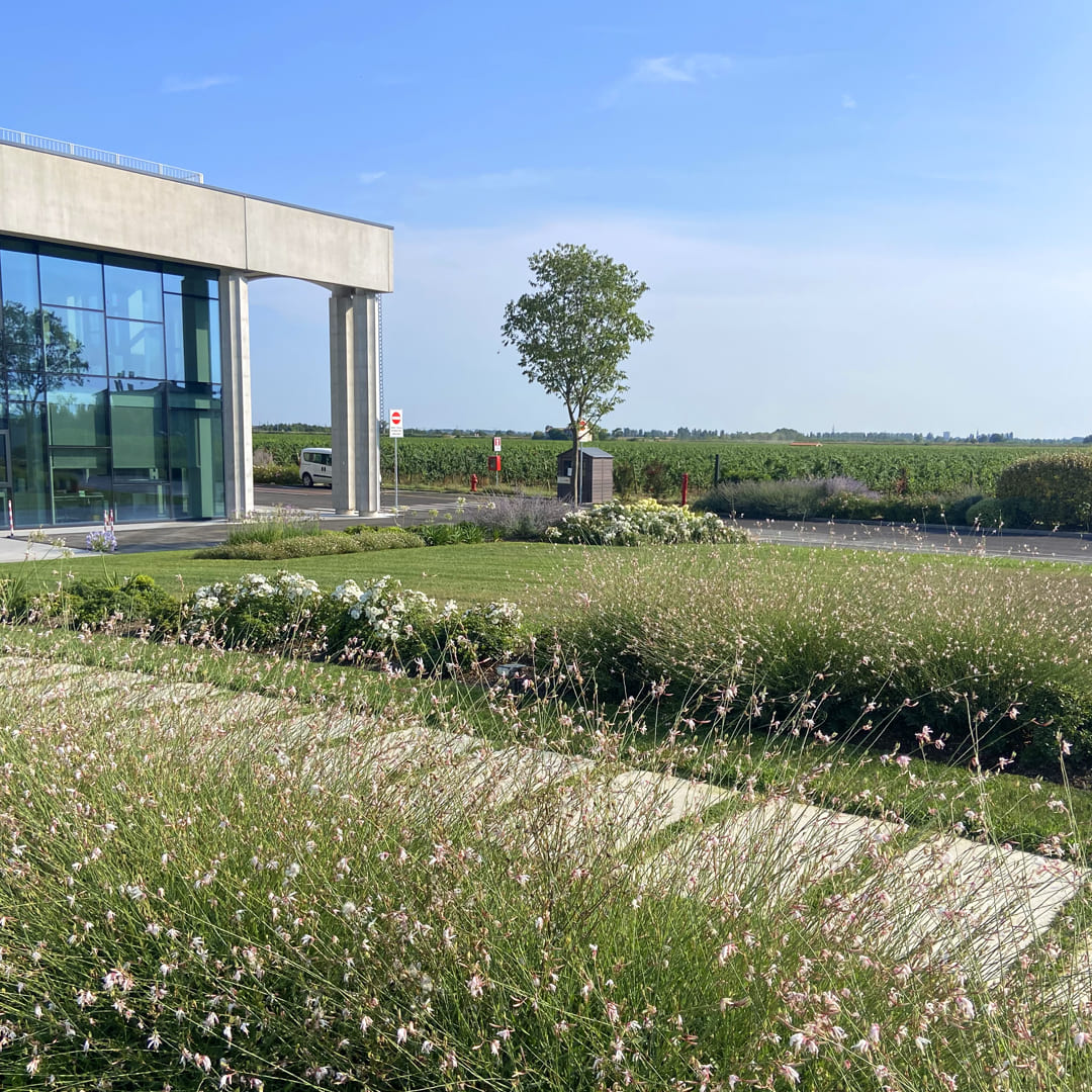 Scopri il connubio artistico e naturale in questo giardino d'arte, una cornice floreale che aggiunge fascino alle vigne di una cantina.
